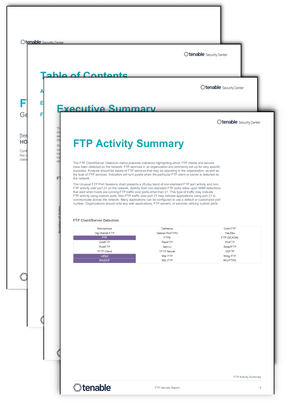 This report provides organizations with the latest information on FTP traffic, vulnerabilities, and compliance checks. Security Center supports active scan data collected using Tenable Nessus, which provides insight into current FTP activity, data leakage, and unauthorized FTP software installed on the network. Passive listening uses the Tenable Nessus Network Monitor (NNM) to detect files transferred to and from FTP servers, as well as FTP clients and FTP port activity. NNM also tracks FTP servers with anonymous access enabled. Having anonymous access enabled can allow anyone to access an FTP server without credentials, which can present serious security risks for an organization. Analysts can use this report to gain an understanding of FTP client and server activity, which can be useful in improving existing security controls to protect confidential data.